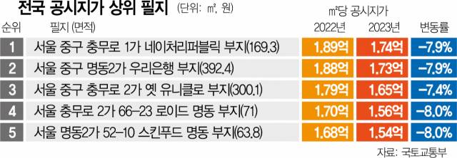 14일 국토교통부가 발표한 2023년 전국 표준지 공시지가에 따르면 중구 충무로1가 네이처리퍼블릭 부지(169.3㎡)의 내년 ㎡당 공시지가는 1억 7410만 원으로 올해(1억 8900만 원)보다 7.9% 떨어졌다.