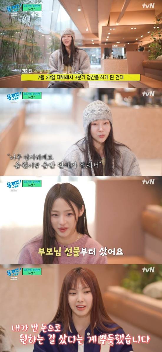 더 나아가 민지는 "(정산을 받고) 부모님 선물부터 샀다. 뭔가 그러고 싶었다. 저는 부모님께 용돈 받고 있다. 감사한 마음을 스스로 번 돈으로 선물을 드리고 싶었다"라며 밝혔다.