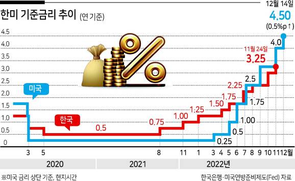 ▶한미 금리 차 1.25%포인트…22년 만에 최대폭 역전=연준의 빅스텝으로 한국(3.25%)과 미국(4.25∼4.50%)의 기준금리 격차는 1.00∼1.25%포인트로 벌어졌다. 이는 미국 금리가 우리나라 금리보다 1.50%포인트 높았던 지난 2000년 10월 이후 최대폭이다.