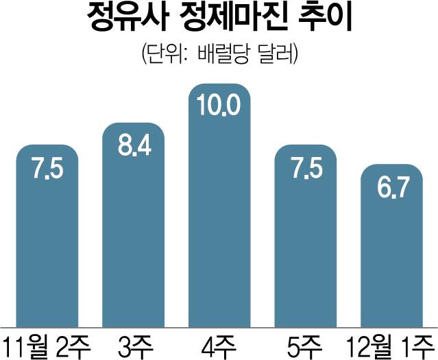14일 업계에 따르면 이달 첫 주 싱가포르 복합 정제 마진은 배럴당 6.7달러를 기록했다. 11월 넷째 주 배럴당 10.0달러로 오른 정제 마진은 그 다음 주 배럴당 7.5달러로 급격히 하락했으며 이후 6.7달러로 또 떨어졌다. 국제 유가 역시 내년 1월물 서부텍사스산원유(WTI) 가격이 9일 배럴당 71.02달러에 거래를 마치며 연중 최저치를 기록했다.