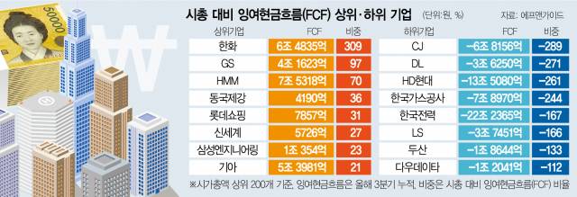 15일 에프앤가이드에 따르면 국내 상장사 시가총액 상위 200개 기업 가운데 시총 대비 잉여현금흐름(FCF) 비율이 가장 높은 기업은 한화(000880)다. 한화는 올해 3분기 기준 약 6조 4800억 원의 잉여현금을 보유하고 있다. 시총(약 2조 1000억 원)의 3배에 달하는 현금을 금고에 쌓아두고 있는 셈이다. 내년에는 기업들의 실적이 빠르게 악화될 것으로 예상되는 상황에서도 한화는 든든한 현금을 바탕으로 이익 성장을 이어갈 것으로 전망된다. 내년 한화의 예상 영업이익은 전년 대비 6.49% 개선된 3조 2524억 원이다. 박종렬 흥국증권 연구원은 “내년 실적 우려가 커지는 상황에서도 방산·태양광 등 다양한 포트폴리오를 갖춘 한화의 이익 변동성은 크지 않을 것”이라며 “견조한 실적 모멘텀이 이어지며 주가 재평가로 연결될 것”이라고 설명했다.