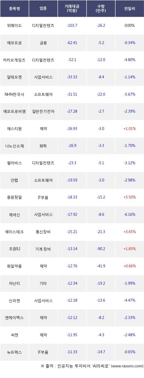 외국인 투자자의 순매도 상위 20개 종목은 위메이드, 에코프로, 카카오게임즈, 알테오젠, NHN한국사이버결제, 에코프로비엠, 에스티팜, 나노신소재, 펄어비스, 안랩등이다.