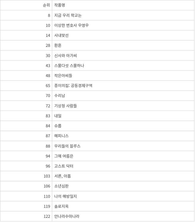 우리나라 작품 중 가장 높은 순위는 1월에 공개된 좀비 학원물 ‘지금 우리 학교는’(8위·이하 지우학)과 6~8월 방영된 휴먼 드라마 ‘이상한 변호사 우영우’(10위·이하 우영우)였다. 지우학은 특히 첫 4주 동안 시청된 누적 시간이 5억6000만 시간을 넘겨, 역대 넷플릭스 비영어권 시리즈물 중 4위로 기록됐다.