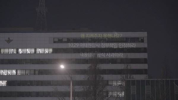 청년추모행동 측은 어제 밤 10시쯤 대통령실 건물 외벽에 "10·29 참사 정부 책임 인정하라, 대통령이 공식 사과하라"는 내용의 문구를 15분간 비추는 시위를 진행했습니다.