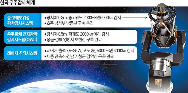 지금껏 한국은 미국 연합우주작전센터(CSpOC)에서 제공하는 우주물체 궤도 정보 및 우주위험 정보에 의존해 왔다. 고도 2000㎞ 이하 저궤도를 감시하는 OWL과 특정 객체를 추적하는 레이저추적시스템 등을 운용하고 있지만 중·고궤도 영역은 감시 공백이 있다.