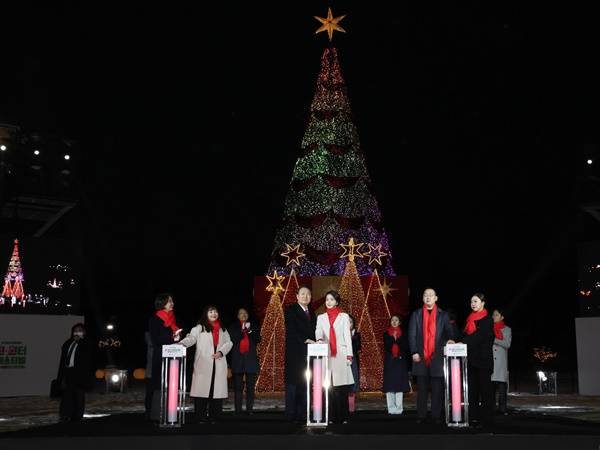 이곳에서 오후 5시 30분부터 이영 중소벤처기업부 장관의 선언으로 시작한 '윈-윈터 페스티벌' 개막식에 깜짝 등장을 한 것. 곧바로 무대에 오른 윤 대통령 부부는 사회자의 구호에 맞춰 대형 크리스마스 트리의 점등 버튼을 눌렀다. 그리고 불이 들어오자 참석자들과 함께 박수를 쳤다.