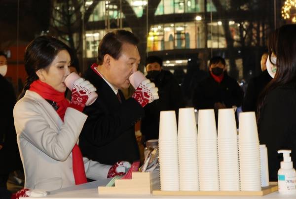 | ▲ 윤석열 대통령과 김건희 여사가 16일 오후 서울 종로구 열린송현광장에서 열린 윈·윈터 페스티벌 개막식에서 에어돔 부스를 방문, 음료를 마시고 있다. |