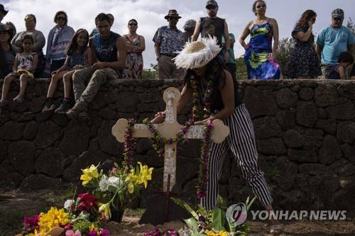 A person places a karone tiare necklace of flowers on the gravesite cross of local horse breeder and former military diver Emilio Araki during his burial at the cemetery in Hanga Roa, Rapa Nui, or Easter Island, Chile, Saturday, Nov. 26, 2022. The first Europeans arrived to Rapa Nui in 1722, soon followed by missionaries, when Rapanui religiosity began to intertwine with Christianity. (AP Photo/Esteban Felix)