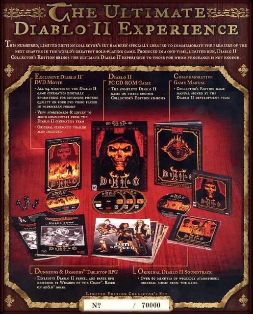 디아블로2 소장판은 전작 패키지 대비 박스 크기가 약 1.5배 커졌다. 디아블로1처럼 겉표지를 열면 아마존, 바바리안, 소서리스 등 디아블로2 캐릭터 5종, 게임 플레이 스크린샷과 함께 어떤 게임인지 소개하는 문구들을 볼 수 있다.