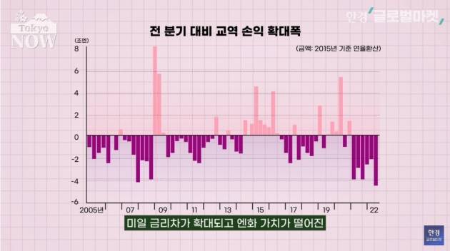 일본의 부가 얼마나 빠져나갔는지는 교역손실로 확인할 수 있다. 실질 국내총생산(GDP)에서 가격과 교역조건 변화를 반영한 실질 국내총소득(GDI)을 뺀 수치다. 올해 1분기 11조5000억엔(연율 환산치) 어치의 부가 일본을 빠져나갔다. 2분기 16조엔으로 늘어난 유출 규모는 3분기 19조7284억엔(약 189조원)으로 통계 비교가 가능한 1994년 이후 최대치를 기록했다.