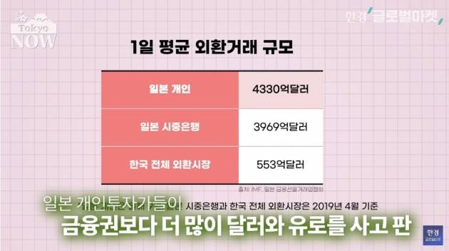 개인투자가들의 1일 평균 외환거래 규모는 약 60조엔(약 4330억달러)이다. 일본 시중은행들의 1일 평균 외환거래 규모는 55조엔(약 3969억달러)다. 일본 개인투자가들이 외환을 본업으로 하는 시중은행보다 더 많은 외화를 사고 판 것이다. 한국 외환시장의 1일 평균 거래액은 553억달러로 일본 개인의 8분의 1 수준이다.