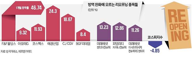 특히 중국 내 매출 회복이 기대되는 화장품 업체들의 주가 상승이 두드러졌다. 아모레G와 아모레퍼시픽은 이 기간 각각 9.32%, 4.33% 올랐다. 애경산업과 코스맥스도 같은 기간 24.3%, 11.93% 뛰었다. 의류 업체 중에는 중국 내 매출 호조가 예상되는 F&F홀딩스의 주가가 한 달 동안 46.74% 상승했다. 최근 한 달간 유가증권시장 종목 가운데 상승률 3위였다. 국내 리오프닝과 연관이 깊은 CJ CGV(18.67%), 롯데칠성(18.02%), BGF리테일(8.40%) 등도 시장 수익률을 넘는 상승세를 보였다.
