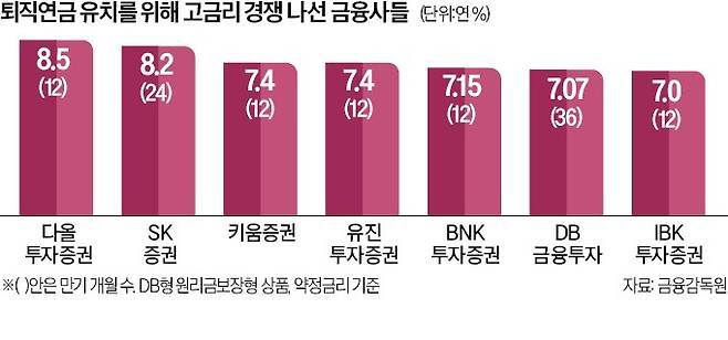 문제는 이 과정에서 퇴직연금사업자로 등록하지 않은 중소형 금융회사들이 높은 금리를 제시하며 머니무브를 가속화하는 등 시장을 교란하고 있다는 점이다. 실제 연 7.0%가 넘는 확정금리를 제공하겠다는 증권사 7곳 가운데 DB금융투자를 제외한 나머지 6곳은 모두 비사업자다.