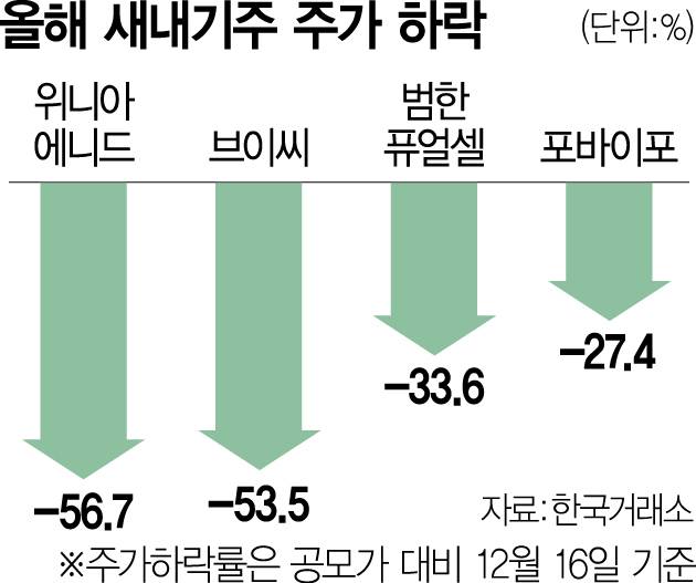 공모주의 수익률도 저조했다. 이날 기준 상장을 마친 69개 종목의 상장 이후 평균 수익률은 5.97%에 불과했다. 특히 46개의 종목(65.71%)은 16일 기준 종가가 공모가(무상증자를 한 경우 이를 반영한 수정 공모가 기준)를 밑돌았다. 올해 2월 24일에 상장한 브이씨는 공모가 대비 53.5% 하락했다. 위니아에이드·레이저쎌·나래나노텍 등도 공모가 대비 50% 넘게 떨어졌다. ‘따상(시초가가 공모가의 두 배로 형성되고 장중 상한가 기록)’의 효과도 얼마 가지 않았다. 4월 28일 상장 첫날 따상에 성공했던 비주얼 테크 솔루션 기업 포바이포는 상장 이후 주가가 27.4% 빠졌다. 미술 경매사 케이옥션 역시 1월 24일 상장 첫날 따상을 기록했으나 현재 주가는 19% 하락했다.