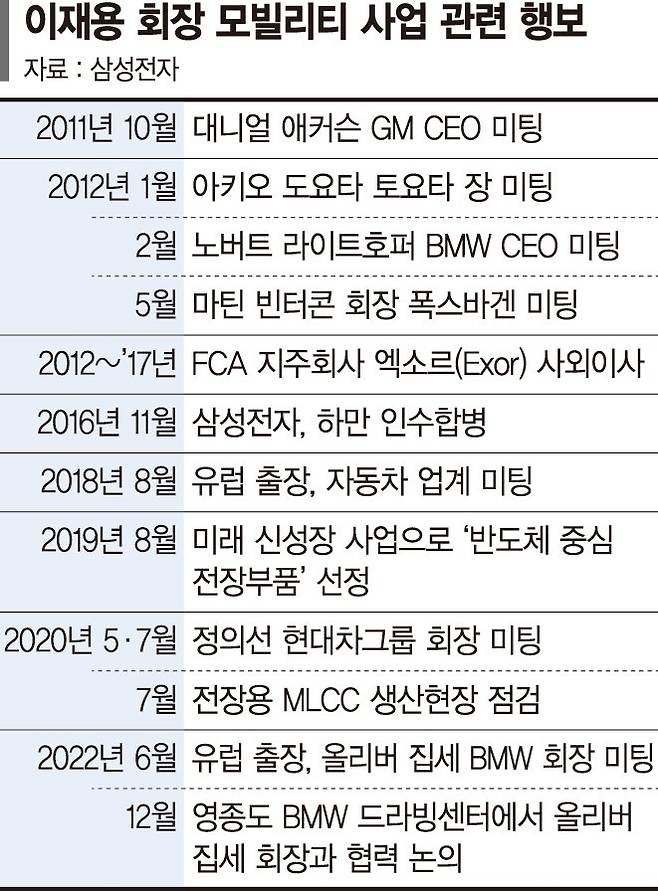 이 외에도 이 회장은 2020년 5월 삼성SDI 천안사업장을 찾은 정의현 현대차그룹 회장에게 차세대 전고체 배터리 기술을 설명하기도 했다. 같은 해 7월에는 이 회장과 삼성 주요 경영진이 현대·기아차 남양기술연구소를 방문해 정 회장 등 현대차그룹 경영진과 미래차 및 모빌리티 분야 기술 방향성에 대한 의견을 나누기도 했다.