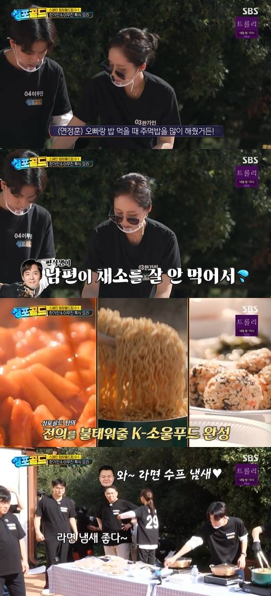 한가인은 이무진과 함께 주먹밥 만들기에 열중하다가 "(연정훈과) 신혼 때 밥을 할줄 모르니까 주먹밥 많이 했었다. 그 때 만들었던 것이 지금 도움이 되는 것 같다"면서 웃었다.