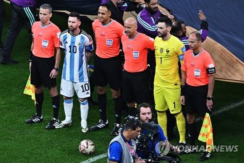 epa10372276 (L-R) Assistant referee Tomasz Listkiewicz, Lionel Messi of Argentina, the fourth official Ismail Elfath, referee Szymon Marciniak, Hugo Lloris of France, and assistant referee Pawel Sokolnicki pose ahead of the FIFA World Cup 2022 Final between Argentina and France at Lusail stadium, Lusail, Qatar, 18 December 2022. EPA/Noushad Thekkayil
