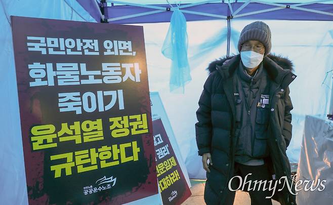 지난 15일, 이봉주 민주노총 공공운수노조 화물연대본부 위원장을 만났다. 깡마르고 눈이 움푹 파인 이 위원장은 "대한민국이 무섭다"고 했다. 한파 속에서도 그는 현재 국회 앞 천막에서 단식 농성중이다.