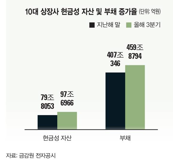 잿빛 전망이 지배적이다 보니 기업들 입장에선 결국 돈줄을 죄는 것 외에 별다른 방법이 없게 됐다. 기업들은 돈 쓰는 일은 최대한 자제하면서 현금을 확보하는 데 치중하고 있다. 실제로 삼성과 SK, 현대차, LG 등 시가총액 상위 10대 기업의 현금 및 현금성 자산이 올해 들어 크게 증가했다. 지난 9월말 기준으로 현금성 자산은 97조6966억원으로 전년 말(79조8053억원) 대비 17조8914억원(22.4%)이나 증가했다. 특히 7~9월에만 10조원 이상 현금성 자산이 증가한 것으로 나타났다.