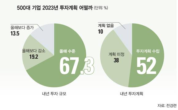 12월5일 전경련이 매출액 상위 500대 기업을 대상으로 '2023년 국내 투자계획'을 조사한 결과도 크게 다르지 않았다. 응답에 참여한 기업 100곳 중 48%가 내년 투자계획이 없거나 아직 계획을 세우지 못했다고 답했다. 그나마 52%는 투자계획을 수립했으나, 투자를 축소할 것(19.2%)이라고 답한 기업이 확대하겠다(13.5%)는 답변보다 많았다. 투자를 꺼리는 주요 이유로는 금융시장 경색과 자금 조달 애로(28.6%), 원-달러 환율 상승(18.6%), 내수시장 위축(17.6%) 등이 꼽혔다. 한 4대 그룹 인사는 "지금 가끔씩 부각되는 기업들의 대규모 투자 소식은 알고 보면 대부분 이전에 잡아놓은 것들"이라면서 "이전 계획을 그대로 진행하는 것 자체도 부담스러운 게 현실이다"고 전했다.