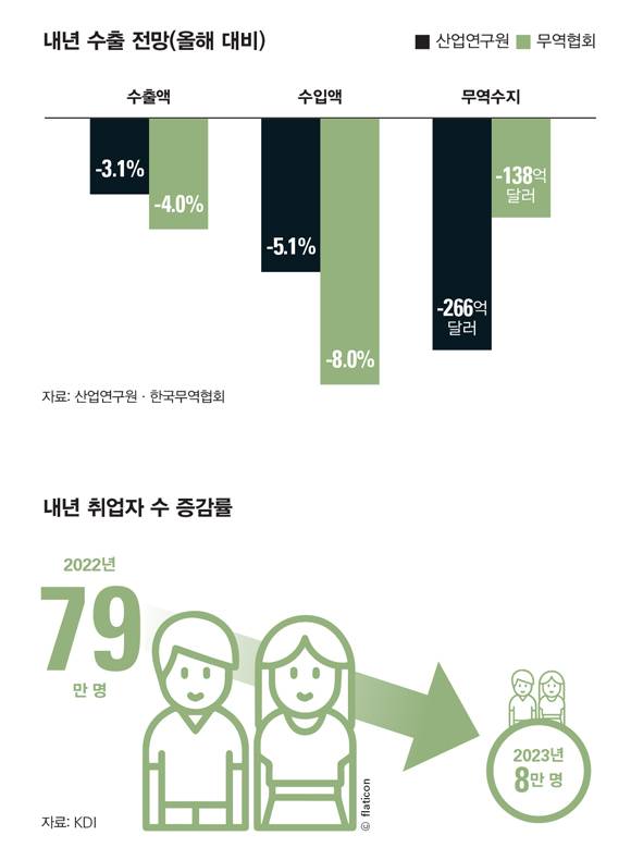 한국 경제의 버팀목이던 수출 상황도 녹록지 않다. 지난 10월 우리 기업 수출액이 기존 최고 실적인 6444억 달러를 넘어섰다. 코로나 팬데믹과 러시아-우크라이나 전쟁, 글로벌 경기 침체 우려에도 2년 연속 수출 기록을 경신한 것이다. 연간 무역 규모 1조 달러 돌파는 9월14일 일찍이 달성한 상태다. 수출 순위는 세계 7위에서 6위로 한 계단 올랐다. 겉으로 봐서는 나쁠 게 없다. 하지만 속내를 들여다보면 상황이 다르다. 4분기 들어 수출 감소세가 뚜렷해졌기 때문이다. 10월과 11월 연속으로 마이너스 성장을 기록했다. 12월 역시 화물연대 파업 여파로 인해 수출 실적이 좋지 않을 것으로 예상된다. 산업연구원 관계자는 "현재의 경제 상황을 감안할 때 내년 수출액은 올해 대비 3.1% 감소할 것으로 예상하고 있다"고 말했다.