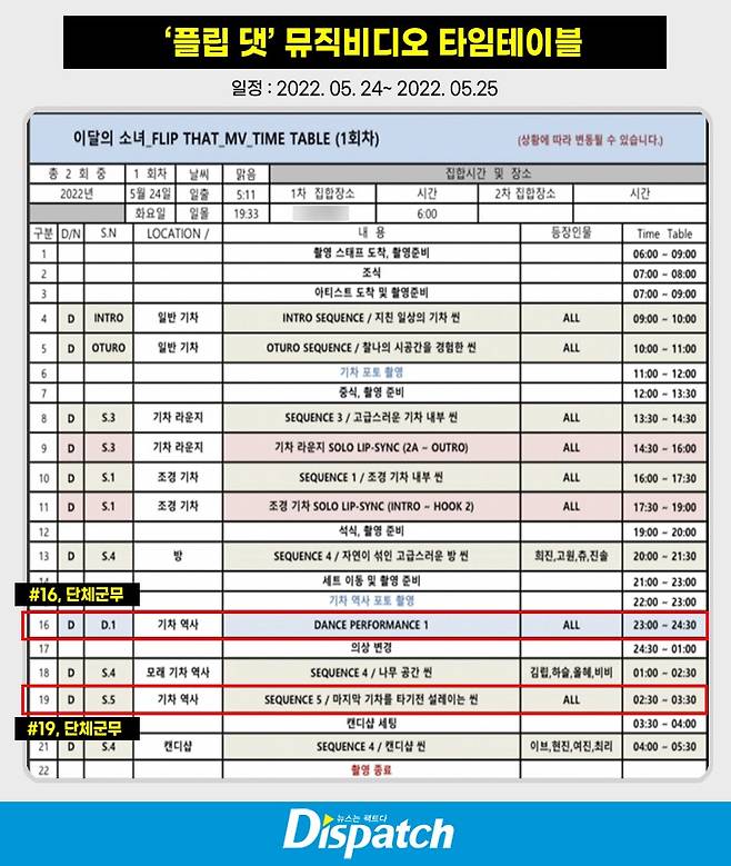 ① 5월 24일 오전 9시, '플립댓' 뮤비 촬영을 시작했다. ② 촬영이 늦어졌고, 오후 11시 예정인 군무신(#16)도 밀렸다.