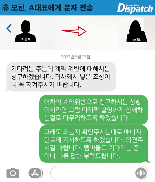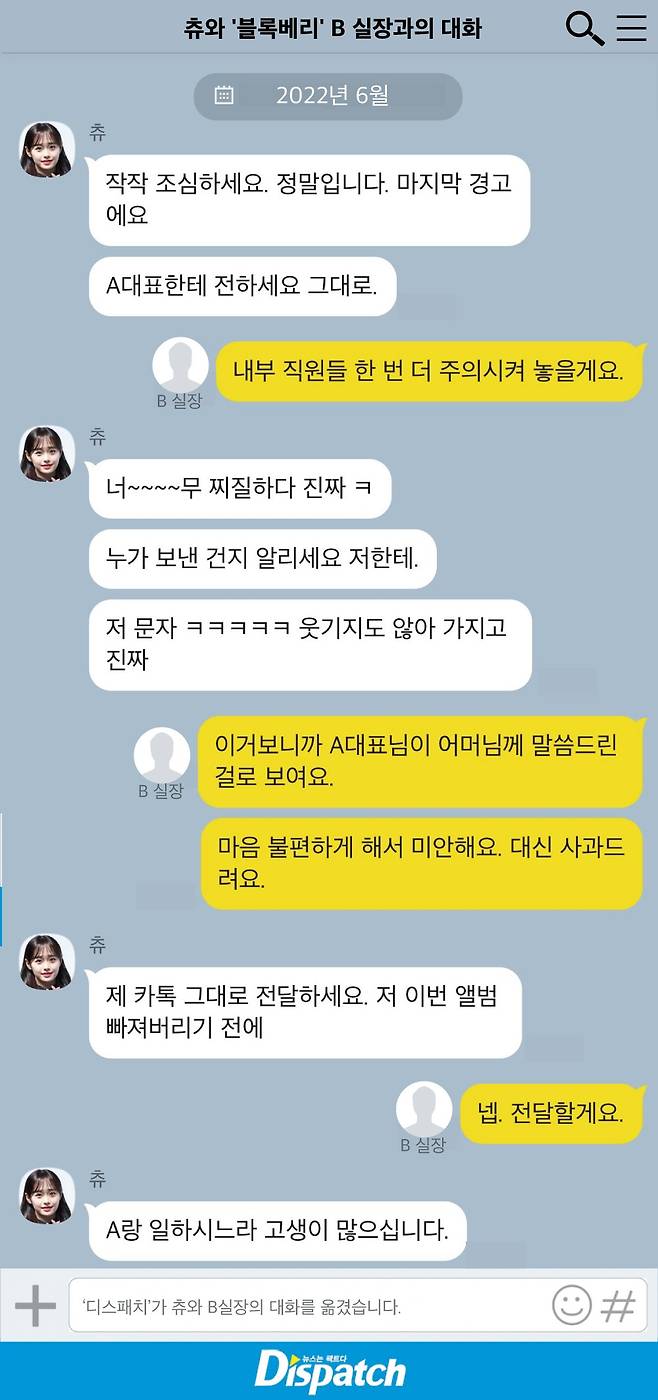 '디스패치'는 츄와 A대표, 츄와 B실장, 츄 모친과 A대표이 나눈 대화 및 녹취록을 확보했다. 문자와 통화 내용을 통해 지난 1년간 벌어졌던 일들을 종합적으로 파악할 수 있었다.