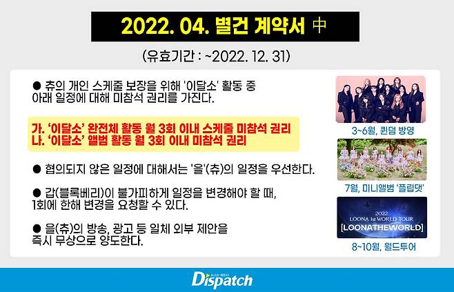 츄는 ‘이달소’ 활동 불참 권리도 챙겼다. “츄의 개인 스케줄 보장을 위해 ‘이달소’ 활동 중 아래 일정에 대해 미참석 권리를 가진다”고 명시했다.