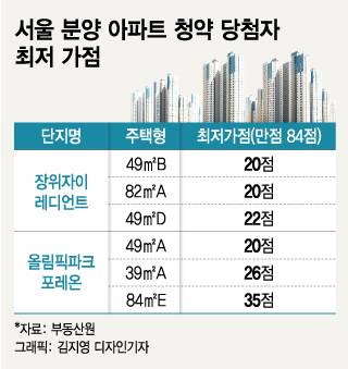 전날 당첨자를 발표한 '올림픽파크포레온'도 상황은 다르지 않았다. 전용 49㎡에서 최저가점 20점이 나왔다. 주택형 별로 가점 커트라인의 차이가 컸는데, 전용 39㎡(37.09점) 전용 49㎡(37.51점) 전용 84㎡E(47점) 등 3개 주택형은 평균 가점이 50점을 밑돌았다.