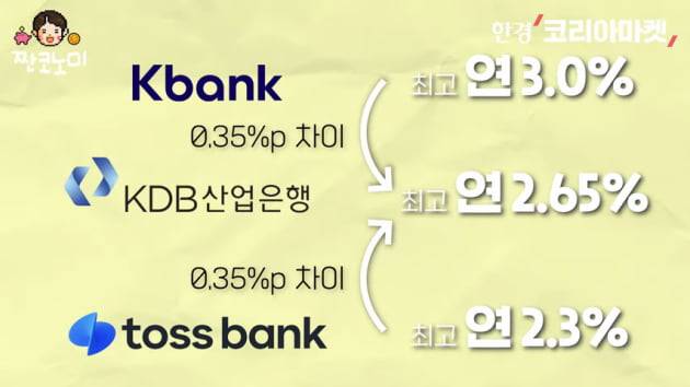 1금융권에서 최고 금리 기준으로는 토스뱅크가 가장 높은 금리를 자랑하게 됐습니다. 하지만 기본 금리만을 놓고 봤을 땐 연 3%대 금리 상품도 존재합니다. 케이뱅크는 같은날 파킹통장 상품인 '플러스박스'의 금리를 연 3%로 0.3%포인트 올렸습니다. 기본 금리만 놓고 보면 1금융권에서 가장 높은 수준입니다.