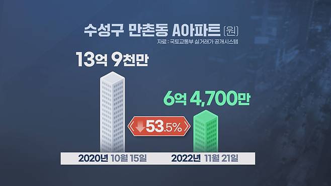 이 밖에도 대구시 중구의 한 아파트 단지의 전용면적 75제곱미터 아파트도 11월 25일 3억 4,500만 원에 거래되어 최고점인 2020년 12월의 6억 5,800만 원과 비교해 47.5%가 떨어졌습니다.