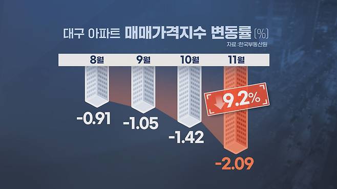 한국부동산원의 대구지역 아파트 매매가격지수 변동률은 지난 11월 -2.09%를 기록해 2022년 들어 가장 많이 떨어졌습니다.