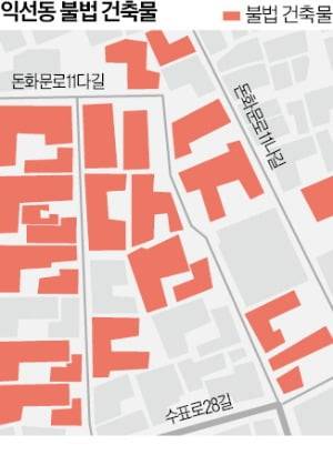 한국경제신문 취재팀과 서울 익선동, 망원동 망리시장 등의 골목을 둘러보던 공무원들은 건축물대장, 평면도와 실제 건물을 천천히 살펴본 뒤 이렇게 입을 모았다. 19일 한국경제신문이 서울 주요 8대 상권의 지하철 반경 500m 이내 폭 5m 이하 골목을 전수조사한 결과 이런 문제는 곳곳에서 확인됐다. 위반 건축물이 없는 길을 찾기가 더 어려웠다.