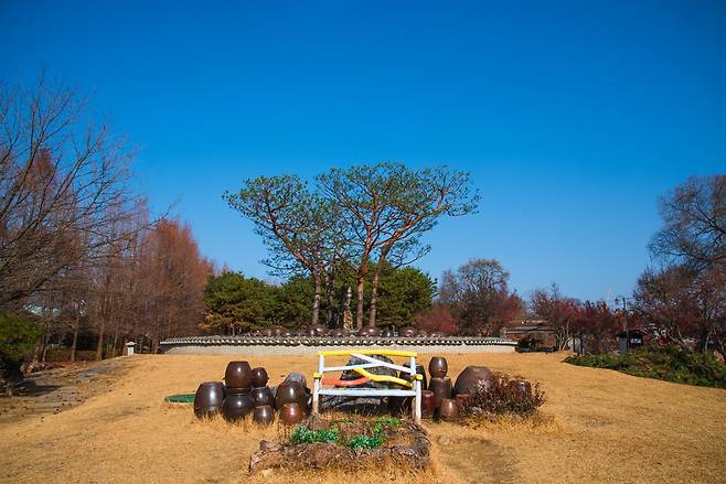 가장 먼저 눈에 띈 곳은 메마른 우리내 징검다리를 지나면 보이는 장독대 분수. 동절기라 분수대가 가동하지는 않지만, 중앙의 나무와 그 앞에 수수깡들을 이어 붙인 듯한 의자가 겨울의 누런 잔디와 어우러져 멋진 경관을 선사해 준다.