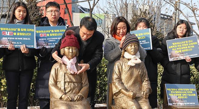 이승로 성북구청장, 한정화 독일 평화의 소녀상 지킴이 대표가 19일 서울 성북구 성북천 분수광장에서 성북구 청소년들과 함께 평화의 소녀상 건립 해외도시 응원 메시지를 전달하고 있다.