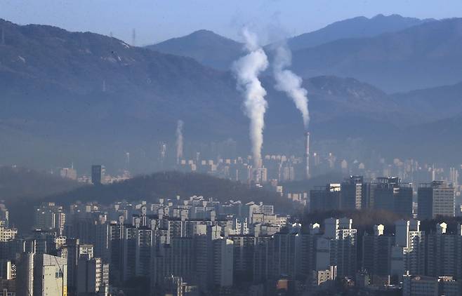 [서울=뉴시스] 김금보 기자 = 한파가 계속되면서 전력수요가 역대 동절기 중 최고치를 기록하고 있다. 20일 오전 서울 중구 남산에서 바라본 서울시내 발전소와 빌딩에서 수증기가 나오고 있다. 2022.12.20. kgb@newsis.com