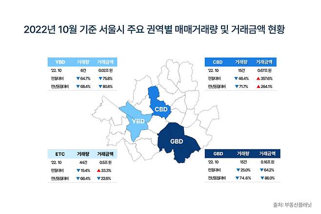 1년새 매매거래량이 가장 크게 하락한 지역은 GBD(강남구, 서초구)로 나타났다. 이 지역은 올해 10월 단 15건의 거래만 이뤄졌다. 전년 동월 59건 대비 74.6% 하락한 것으로 서울 3대 업무지구 중 최대 낙폭세를 보였다. CBD(중구, 종로구) -71.7%, YBD(영등포구, 마포구)는 -68.4%도 큰 하락을 보였다.