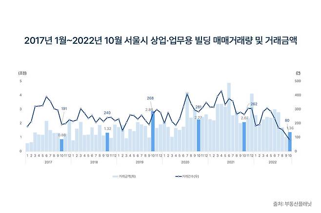 20일 상업용 부동산 전문기업 부동산플래닛이 국토교통부 실거래가를 기반으로 빌딩 매매거래를 분석한 결과 10월 서울시 상업·업무용 빌딩 매매거래량은 80건을 기록했다. 이는 지난 2008년 9월 리먼브라더스 파산으로 당시 10월부터 이듬해 1월까지 4개월 간 88, 50, 69, 61건 등 월 100건 이하의 거래량을 보인 것과 유사하다.