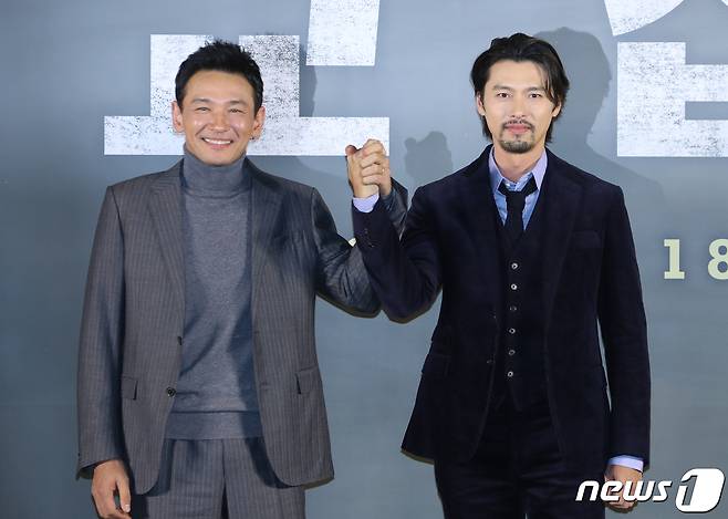 (서울=뉴스1) 권현진 기자 = 배우 황정민과 현빈(오른쪽)이 20일 서울 성동구 메가박스 성수에서 열린 영화 '교섭' 제작보고회에서 포즈를 취하고 있다.