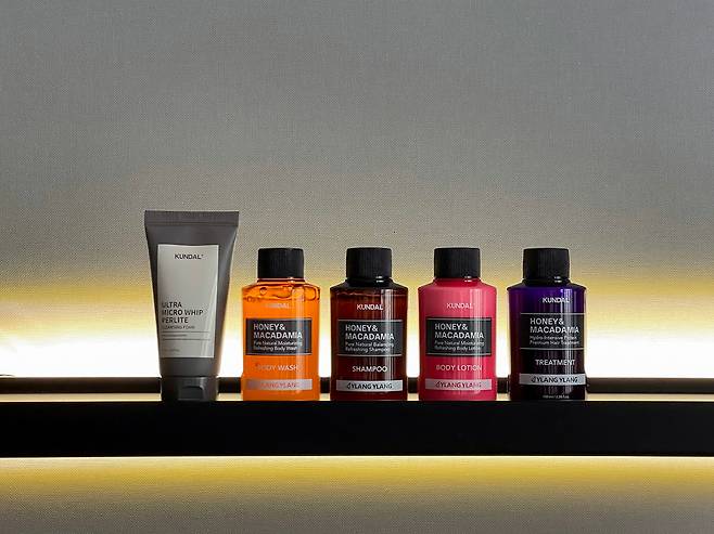피부 보습과 진정에 도움을 주는 '쿤달 허니 앤 마카다미아 퓨어 바디워시(100ml)와 바디로션(100ml)', 펄라이트 10,000ppm이 함유되어 묵은 각질까지 케어 가능한 '쿤달 울트라 마이크로 휩 펄라이트 클렌징폼(50ml)' 등의 어메니티로 구성됐다.