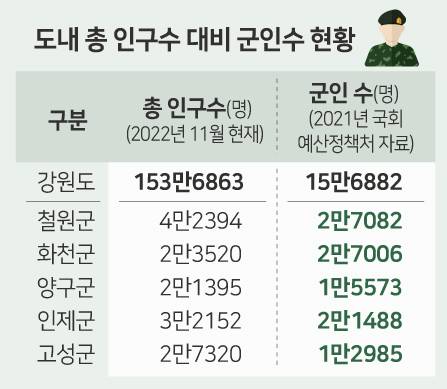 ‘생활인구’ 중에서 시행령으로 위임된 사항인 ‘체류하는 사람’은 체류 횟수가 월 1회 이상인 사람으로 정했다. 월1회 이상 체류자에는 군인 등도 포함된다. 지난 2021년 국회예산정책처가 발표한 자료에 따르면 도내 주둔 군인은 철원, 화천, 인제 각 2만여 명, 양구와 고성 각 1만여 명 등 약 15만여 명에 이른다.