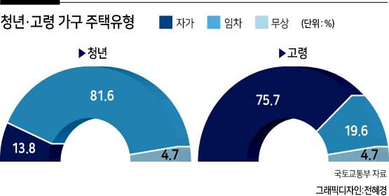 자가에 사는 청년가구는 13.8%, 고령가구는 75.7%로 집계됐다. 청년가구와 고령가구는 거주 형태도 확연히 달랐다. 청년가구는 단독주택비율(37.5%)이 아파트(33.8%)보다 높았다. 다세대 거주 비중도 11.7%나 됐다. 반면 고령가구는 44%가 아파트에 살고 단독 43.4%, 다세대 7.1%가 뒤를 이었다.