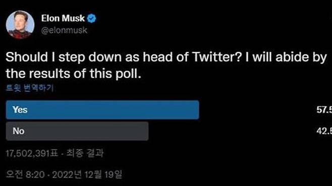 일론 머스크가 트위터 인수 두 달여 만에 최고경영자(CEO) 자리에서 물러나겠다고 밝혔습니다. 자신의 트위터에 "후임을 맡아줄 만큼 어리석은 사람을 찾는 대로 물러나겠다"고 발표했는데, 이에 앞서서는 역시 자기 트위터를 통해 CEO 사임 여부를 묻는 투표를 진행했습니다. 응답자 1천750만여 명 중에 57.5%가 사임에 찬성했습니다. 트위터 인수 이후 직원 수천 명을 대량 해고하고 언론사 기자들 계정을 무더기로 정지시키는 등의 조치로 머스크는 미국 내는 물론 국제적인 비난을 받아왔습니다. 이런 상황이 '머스크 리스크'라 불리면서 테슬라 주가 폭락의 주요 원인으로까지 지목되자 트위터에서 손을 떼기로 한 것으로 보입니다.