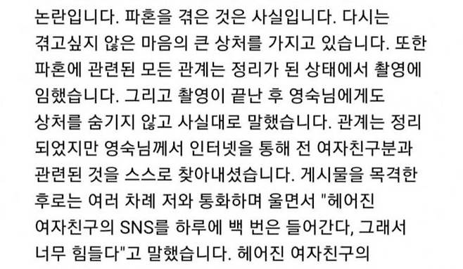 그는 "먼저 현재는 헤어진 여자친구와의 파혼에 대한 논란이다. 파혼을 겪은 것은 사실이다. 다시는 겪고 싶지 않은 마음의 큰 상처를 가지고 있다. 또한 파혼에 관련된 모든 관계는 정리가 된 상태에서 촬영에 임했다. 그리고 촬영이 끝난 후 영숙님에게도 상처를 숨기지 않고 사실대로 말했다"고 밝혔다.