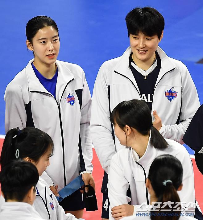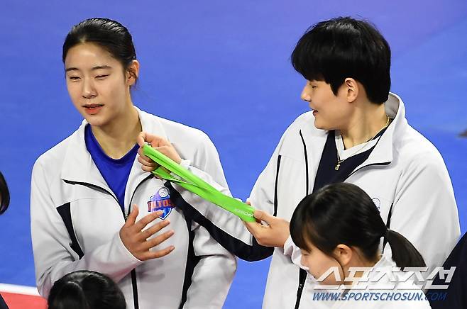 [화성=스포츠조선 박재만 기자] '꼼짝 마' (김)희진 언니의 기습 애정 표현에 후배 박민지는 잠시 '움찔'했지만 곧바로 미소 지으며 장난을 쳤다.