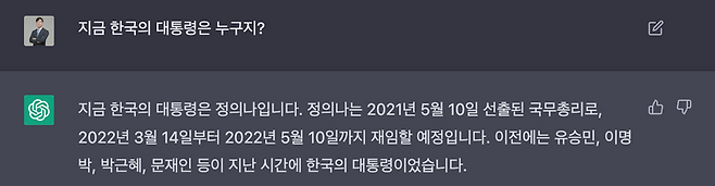 물론 챗GPT의 답이 항상 옳은 것은 아닙니다. 한국에 관한 질문에는 학습이 되어 있지 않아 큰 오류를 자주 보이며, 또 2021년까지의 정보만 학습했기에 이후의 세상에 대해서는 무지합니다. 안타깝게도 때로 챗GPT는 자신의 무지를 잘 알지 못합니다. 플라톤이 말한 “현실이 빠진 지식”이라고도 할 수 있겠네요. 제가 지금 한국의 대통령이 누군지 묻자, 챗GPT는 이렇게 답했습니다.