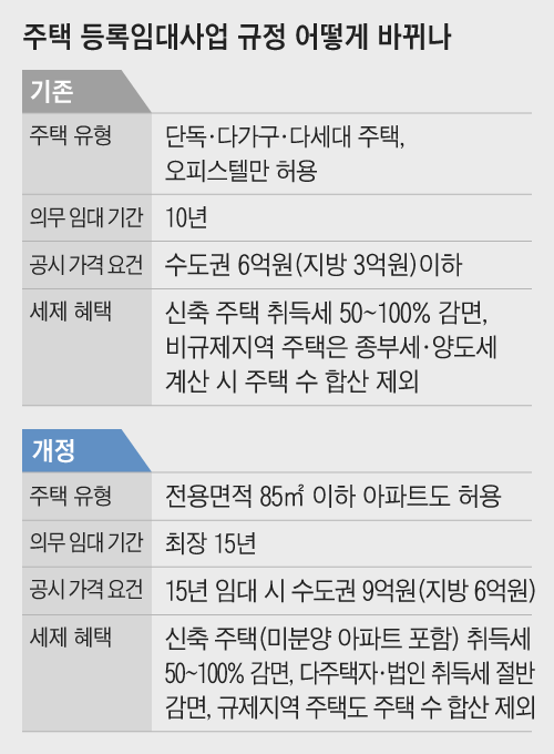정부가 예고한 부동산 규제 완화책 중 주택 수요를 되살릴 수 있는 가장 효과적인 방안으로 다주택자 취득세 완화와 임대사업자 혜택 강화가 꼽힌다. 기존 최고 8%였던 2주택자 취득세는 1주택자(1~3%)와 동일해지고, 3채 이상 다주택자도 취득세가 기존(8~12%) 대비 절반 수준으로 줄어든다. 또 미분양을 줄이기 위해 임대사업자가 신축 주택을 취득하면 취득세가 절반에서 최대 전액까지 감면된다. 기존에는 빌라·오피스텔만 임대주택으로 등록할 수 있었지만 앞으로는 전용면적 85㎡, 공시가격 9억원(수도권 기준·지방 6억원) 이하 아파트도 등록 가능해진다. 공시가 9억원이면 시세 13억~14억원 수준이다. 등록 임대주택은 종합부동산세 과세 대상에서 제외되며, 처분 시 양도세도 기본세율을 적용받는다.