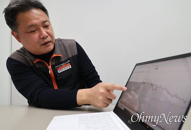 | ▲ 지난 2월 <오마이뉴스> 인터뷰 당시 김기원 사무금융노조 증권업종 본부장. |