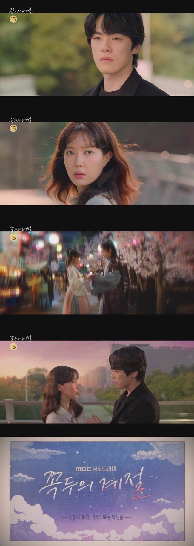 이어 티저 영상은 두 사람이 과거 벚꽃이 흩날리는 아름다운 날에 서로의 마음을 확인하던 연인의 모습과 포개지면서 마무리된다. 마주 서게 된 두 사람은 과연 어떤 과거를 공유하고 있으며 기나긴 시간을 거슬러 다시 만나게 된 이유는 무엇일지 궁금증을 자극한다. (사진=MBC '꼭두의 계절' 티저 캡처)