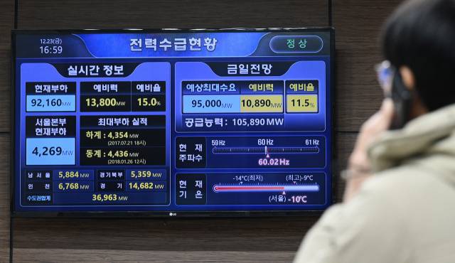 최강 한파와 폭설이 이어진 23일 서울 중구 한국전력공사 서울본부에 설치된 모니터에 전력 수급 현황이 표시되고 있다. 한국전력은 이날 오전 11시 기준 최대 전력(하루 중 전력사용량이 가장 많은 순간의 전력 수요)이 94.5GW까지 치솟아 하루 만에 역대 최고치를 경신했다고 밝혔다. 오승현 기자